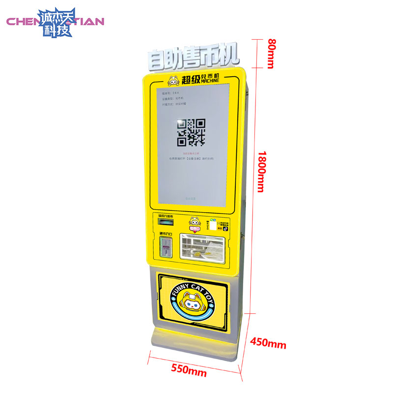 32 inch token changer machine with touchscreen interface and cash payment module installed in arcade center
